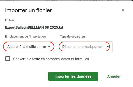 a. Retournez dans le spreadsheet, dans l'onglet "Salaires" et importez le fichier .txt envoyé par AT Patrimoine sur votre ordinateur depuis l'onglet "Salaires" :