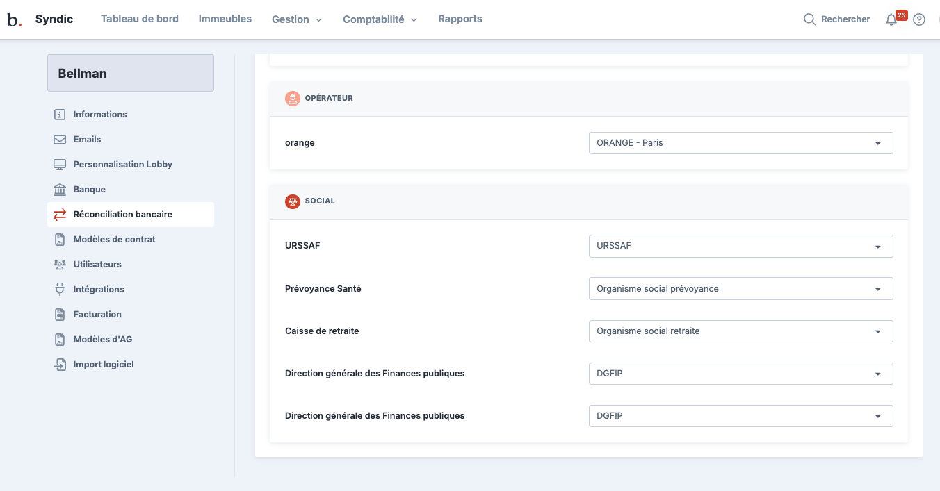 Où retrouver le prestataire standard ? - Il est renseigné dans votre page de paramètres cabinet > réconciliation bancaire > bloc "Social"