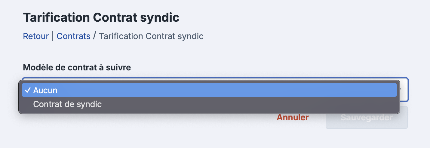 Vous devez impérativement avoir sélectionné et enregistré votre modèle de tarification sur le contrat Syndic.