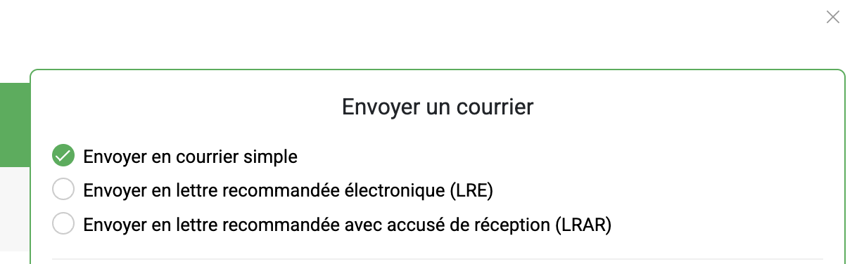 Vous avez la possibilité d'envoyer un Courrier / LRE / LRAR.