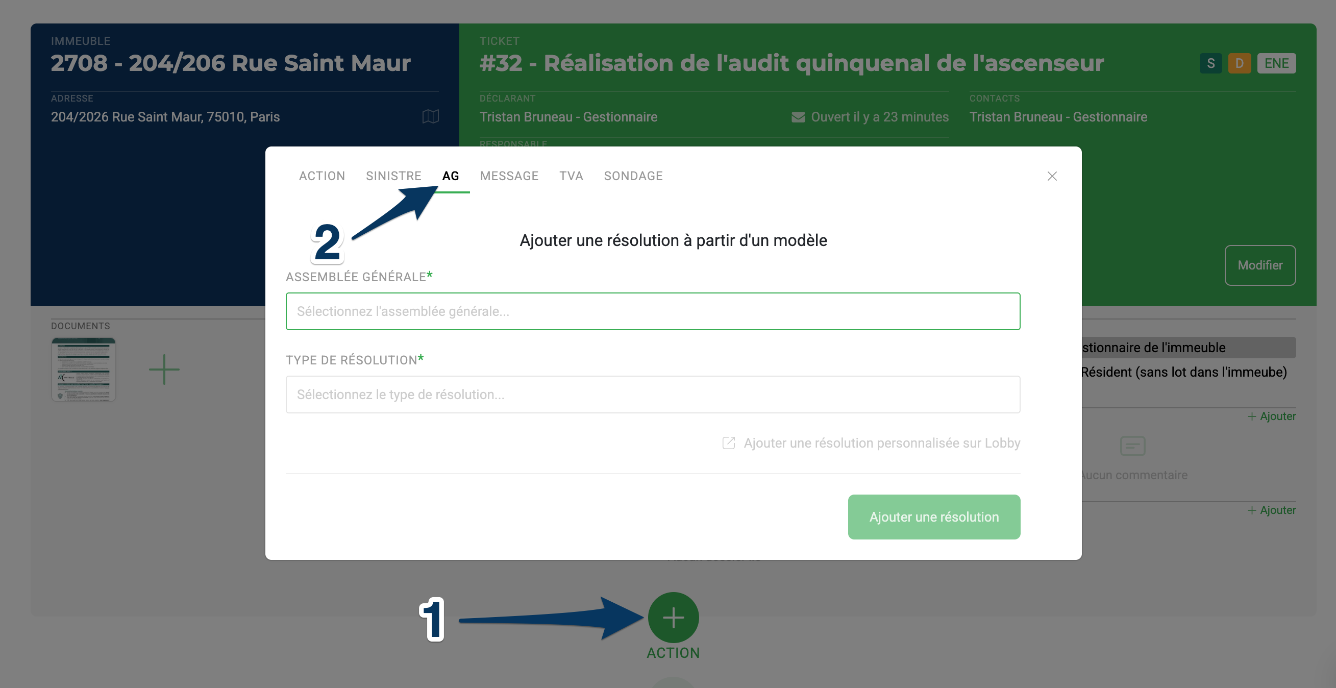 Depuis un Ticket d'intervention > cliquer sur « Action » > puis sur l'onglet « AG ». Les documents et le contenu du ticket seront automatiquement repris dans la résolution d'AG sur Lobby.