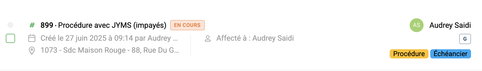 Lorsque vous ouvrez une procédure sur Lobby = au clic sur Mettre en place un échéancier ou Démarrer une procédure d’avocat ou Démarrer une procédure d’huissier, un Ticket est automatiquement créé sur Inch et taggé : Procédure, Sommation de payer, Procédure judiciaire, Échéancier, Vente à recouvrir.