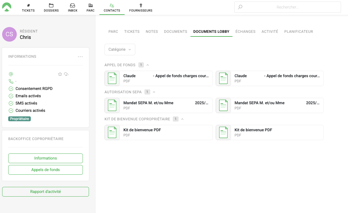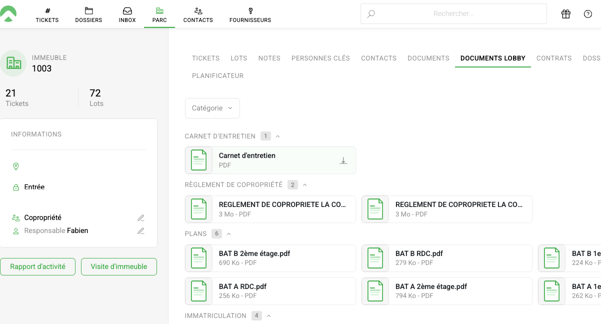 Onglet Parc > Sélectionnez une Copropriété > Documents Lobby